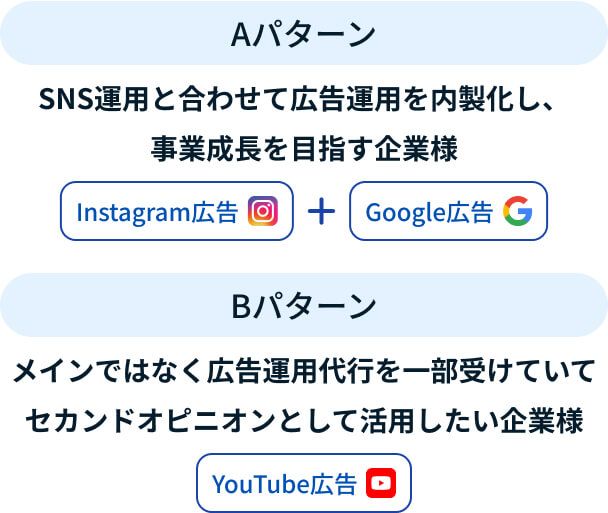 「代理店任せにせず、社内に知見を残したい」企業様に最適な、インハウス支援型の広告コンサルティングサービスです。広告の構造分析・改善方針・KPI設計・媒体ごとの運用ナレッジまで、並走型で支援いたします。特にSNS広告の最適化においてSNS運用が重要になってくるため、通常投稿と合わせて貴社内にノウハウが蓄積される運用体制づくりをサポートします。月間のご予算が30万円以下の企業様に特におすすめのプランです。